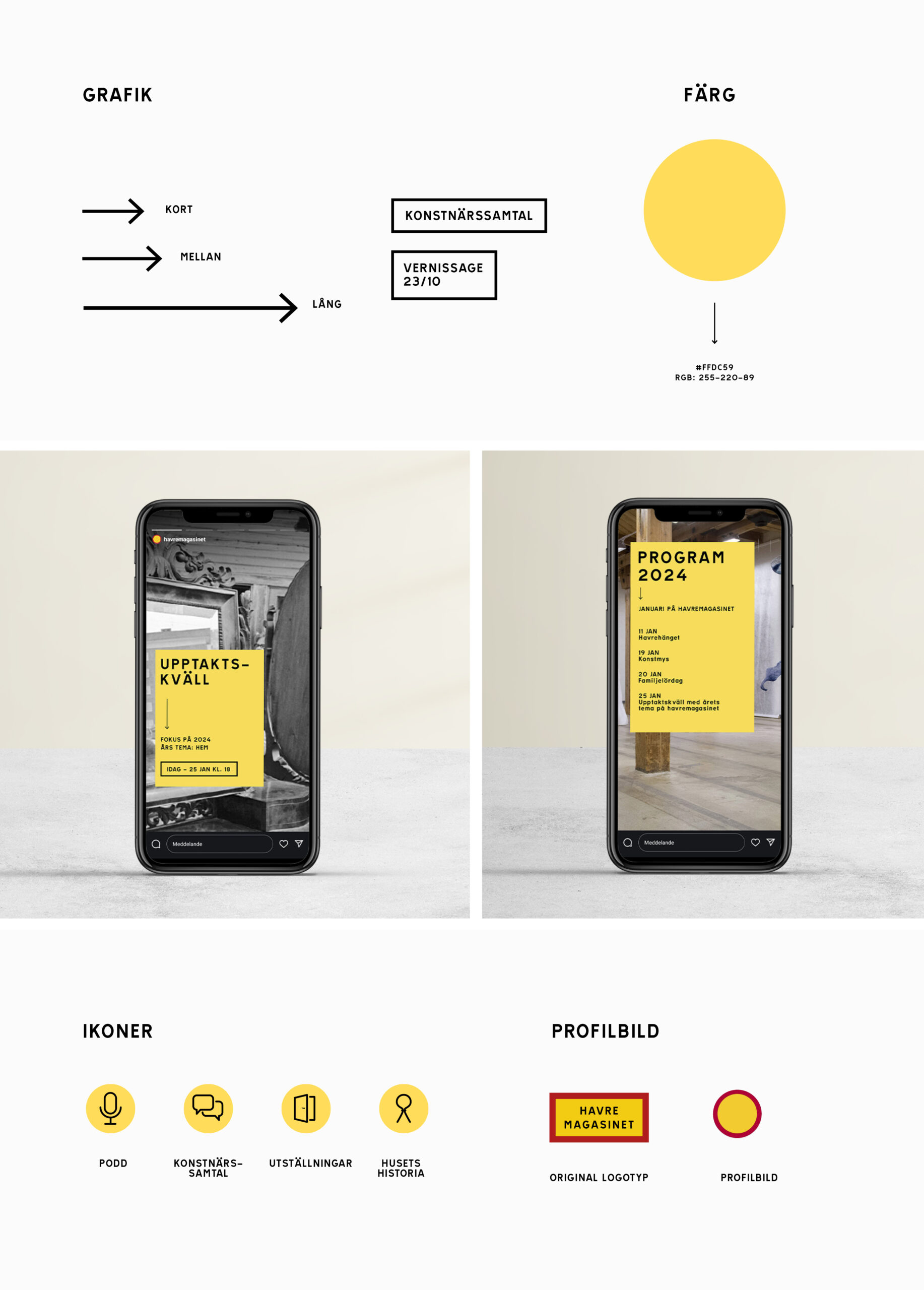 Dokumentet förklarar hur vad och varför och fungerar som en manual. Här samlas den grafiska identiteten med ikoner, grafik, färger och element. Även bildspråket beskrivs för att allt från avsändaren Havremagasinet ska ha samma fina uttryck.