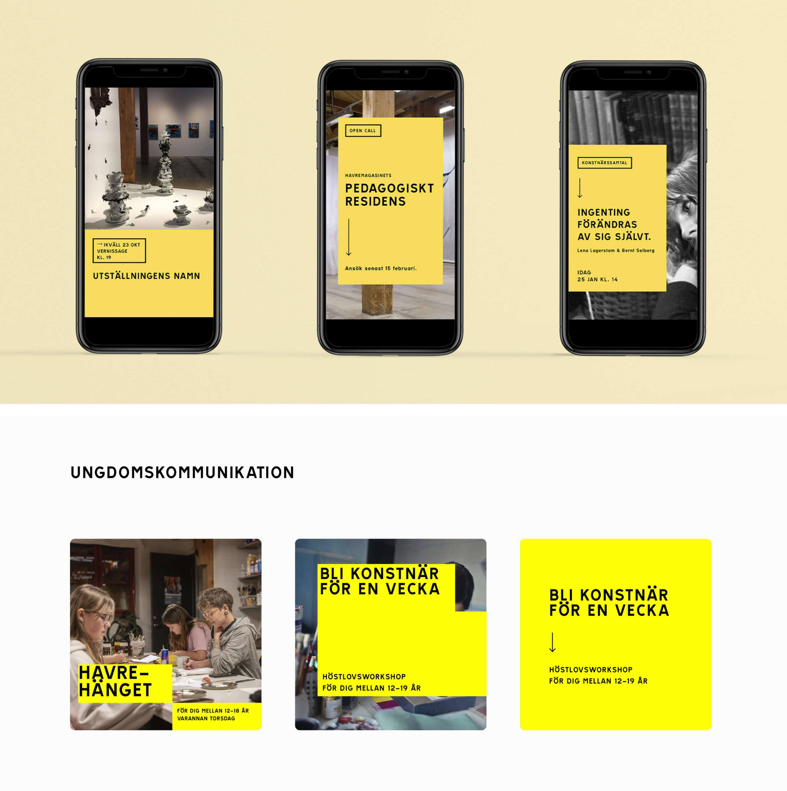 Arbetet innebar att vi samlade, förfinade och införlivade den grafiska profilen i en digital identitet. Vi levererade både ett förklarande dokument och tog utifrån Havremagasinets verksamhet fram olika mallar för deras olika evenemang, som de kunde arbeta med för att praktiskt införliva den nya identiteten. Vi tog även fram en egen look för ungdomskommunikationen som ger ett piggare, ungdomligt uttryck.